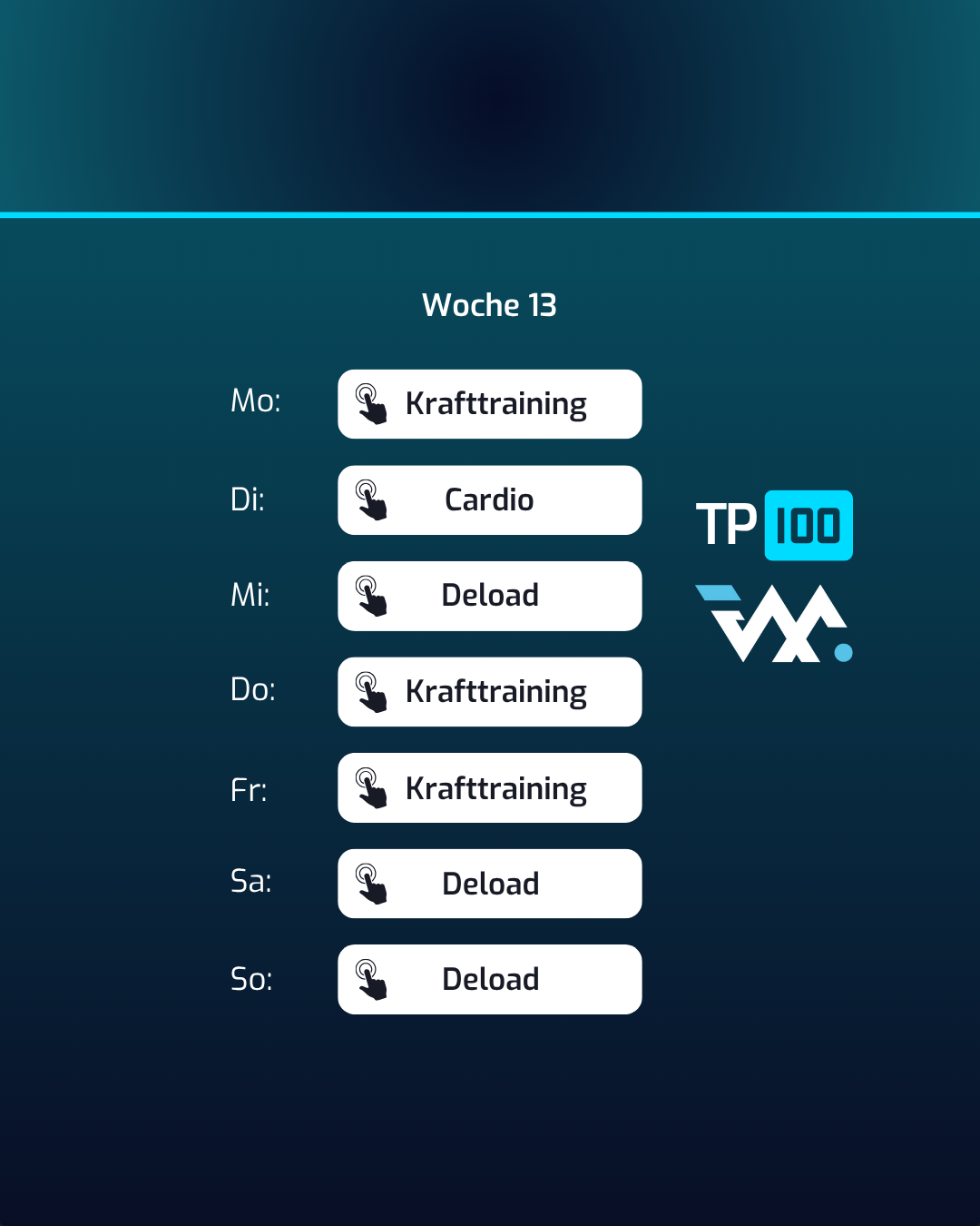 Mit TP100 trainierst du strukturiert wie ein Profi, behältst den Überblick über deinen Fortschritt und merkst Woche für Woche, wie dein Spiel stärker, schneller und kontrollierter wird.